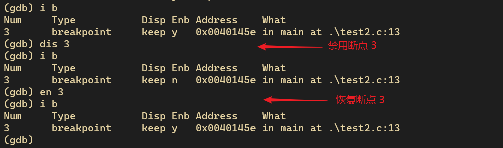 我们使用命令enable 可以重新启用已经禁用的断点。可简写为en